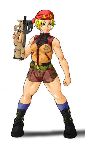 久し振りに描いたベルギー娘のエノーさんです。ムッチムチなケミさんに対して細身で締まった体を目指したのですが、完成したらやはりムッチムチに・・・、ネコ玉はムッチムチなのが大好きなようです、ハイ。ケミさん(縞タン&ニーソ娘)同様高校1年の時に描いたのが元ですが、タンクトップにショートパンツ、2丁拳銃と言う今なら間違いなく某キャラの劣化コピーだと思われそうなキャラデザだったので、ケミさんに引き続きちょっと弄ってみました。オレンジ色のタンクトップはフリースベストに変更、いつもの温泉マークは健在、背中にも大きく入ってます、最初はシンプルなベストにするつもりが肩にコマンドセーター風のガンパッチが付き、それでは飽き足らず現在の様な姿に・・・、首周りの黒い部分は多分革です。ブーツは今までのジャングルブーツだと幾らなんでも『ダサ過ぎる』と感じたので、イケてるかどうかは別として、米軍のタンカーブーツ風のちょっぴりファッショナボーな感じのブーツをでっち上げてみました。P90が茶色いのはこの間買ったCA製電動ガンの影響です、絵的にも真っ黒なのを持たせるよりもカラフルな服装に似合うと思いますし、良いんじゃないっしょか?