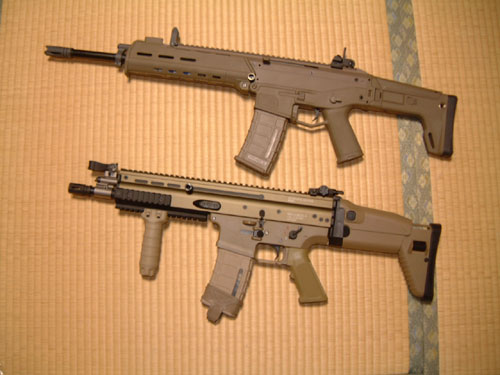 米軍ファンでもないのにネコ玉の家には米軍次期正式採用最有力候補のSCARとMASADAの両方があります、何故買ったか?カッコイイから買ったに決まってるじゃないですか!!メカボの評判が悪いA&K製なので、工具と部品を用意して待っていましたが、蓋を開けてびっくり、滅茶苦茶調子がイイじゃないですか、前々からA&Kはメカボ調整必須と聞いていましたが、既に箱出し状態でチューニングしたSCARと同等の性能を持っています。 ★次期採用候補両雄両者とも同じ目的のために同じ機能に磨きを掛けてきただけあって、各部のデザインはそっくりですが、後発のMASADAはSCARを色々研究して来たという感じですね、無骨な印象のSCARに対してMASADAはスリムでいかにも使い勝手が良さそうです。しかし、XM-8もSCARも「プラスチックを多用した銃は熱に弱いから軍用には不適格だ!!」と、アメリカの兵隊さんから言われてるそうですが、何故かMASADAは「ウン!プラスチックを多用した銃は軽量で過熱しなくてメンテも楽で最高だよね!!」と、言われてるらしい・・・、要は「アメリカ製じゃなきゃ採用しねーよ!」って事か。 ★ストックSCARとMASADAのストック、デザインとサイズの違いはあれど各機能は全く一緒、使い勝手はMASADAの方が一歩リード、ストック自体がSCARの様に軋まないので安心感が全然違います。ただしチークピースの動かし方が分かりません、確か説明書には「先端のミゾを押す」とあったんですけど、1mmも動きません。(ネコ玉はチークピースをあまり使わないほうなので問題は無いんですが・・・。) ★機関部全く同じ機能を備えた機関部、左右どちらでも操作できるデザインになってますけどSCARは若干右利き銃の名残があります、MASADAの操作は完璧にアンビになってます。セレクターは回転角の大きいMASADAよりもHkタイプに近いSCARの方が素早く切り替えが利いて使いやすそうですけど、M16に慣れた米兵にはより操作感覚の近いMASADAの方が受けそうな感じ。トイガンに限って言えばSCARのセレクターはヒドイもんです、元々VFCオリジナルの物を使うはずの所を無理してマルイVer2を入れてるので、左右の動きが会わない上にセミが勝手にフルになる事もしばしば、MASADAはカチッっとしてメリハリの利いた操作感で圧倒的に使い易いです。 ★リアサイトリアサイトです、VFCはスチール削り出しですが、A&Kはアルミか亜鉛のダイキャストです、価格が2倍以上も違うんですからこのくらいの差は当たり前でしょう、ちなみにA&Kのリアサイトはフルで撃ってるといきなり立ち上がります(笑) ★フロントサイトフロントサイトです、MASADAの物は倒すとハンドガードの先端に埋まってしまう上にリアの様にバネが付いてる訳でもないので起こすのが面倒です、ここはSCARの外部に露出してるデザインの方が指で跳ね上げるように起こせるので便利です。 ★マガジンMASADAに付属していたA&K製P-MAGとSCARに使ってるUFC製P-MAG、性能的には両者ともほぼ互角ですが、A&Kは窓がないので中身のギミックが楽しめません。★凄いギミックところでこのA&K製MASADAにはアッと驚くギミックが搭載されています、それは何かと言うと・・・。 ハンドガードを外して。 根元のハンドルをぐるりと回すと・・・・。 ズボッっとバレルが外れました!!とても実売3万円の電動ガンとは思えない機能です、本家マグプルも自社電動ガン発売を目の前にしてこんな品が市場に行き渡ってしまったら立つ瀬がありません、「その銃はうちのデザインだぞ!!」裁判を起こすのも納得です。以前は他社製品のコピーばかりだった本中華もここ最近は完全オリジナルの新製品がちらほら登場する様になって来ました、この勢いで今までに無かった機種をどんどん発売して行ってほしいものです。(日本のメーカーも負けないように頑張って欲しいところですが・・・・) ★政田君ファミリー政田君のご家族と一緒にパチリ。