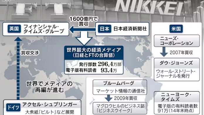 世界のビジネスメディアは「日経・FT」とWSJを傘下に持つダウ・ジョーンズ(DJ)の2強体制に集約される。通信社では米ブルームバーグの存在も大きく、3つの勢力がグローバル市場でせめぎあう構図になる