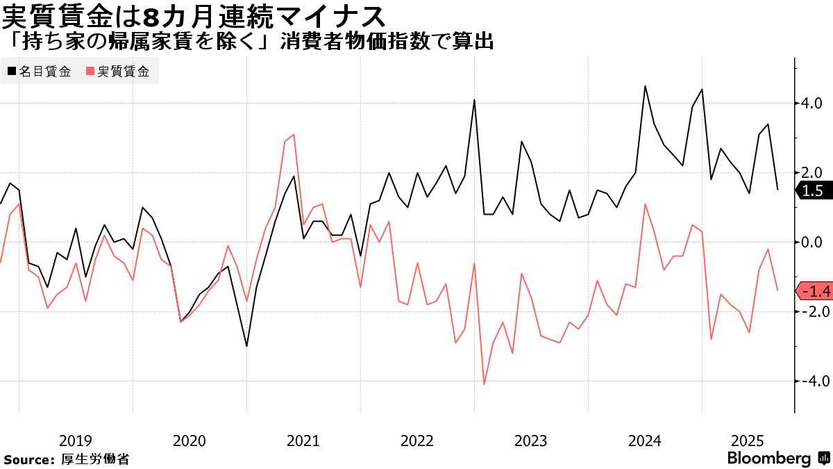 2025/10/08 — 物価変動を反映させた実質賃金は8月に、8カ月連続のマイナスとなった。賞与の押し上げ効果が剥落し、名目賃金の伸びが鈍化した。所得改善の実感が ...