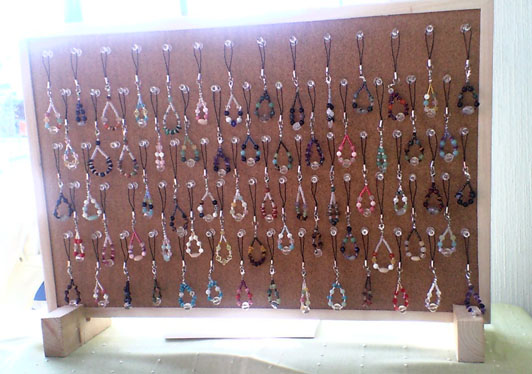 先日のTOYOTAさんのイベント用に作った見本・・・100本ボードには,全部は貼れなかったけど、いかが?デザインが偏らないように,いろんなビーズを使って、全部デザインが違うんだよ!しかも、ふたりでおしゃべりしながら作ったのに不思議な事に,同じ物は一つもなかった!しかも娘に見せたら,どちらが作ったかを、ほとんど言い当てられた(^^;「M先生風」とか「ゆうさん風」とかって相手が作りそうな物を作ったのに,やっぱり同じにはならなかったって,不思議だね。