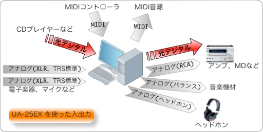 前回予告したように、今回はローランドのUSBオーディオインターフェイス、UA-25EXをレビューします。購入前には分からなかった(わたしだけ?)ことなども織り込みますので、現在購入を検討なさっている方の参考になればと思います。 早い話、UA-25EXはパソコンに電子楽器や音楽機材、オーディオ機器を接続するためのものです。MIDIに関してはわたしが機材を持っていないということもあって割愛して、オーディオ部分についてまとめます。ものすごく端折って書きますので、正確に知りたい方はメーカーサイトのブロック図をご覧ください。 UA-25EXには以下の3つの入力モードがあります。アナログ入力モードデジタル入力モードLoopBackモード まずはアナログ入力モードから。このモードでは、マイクや電子楽器の信号をパソコンに入力することができます。入力した信号はそのままでは出力されませんので、出力したい場合は音楽編集ソフトなどで入力をモニターするか、UA-25EXのダイレクト・モニター機能を使用します。Macには標準で音楽編集ソフト(GarageBand) が付いていますので、UA-25EX(と電子楽器)があれば『宅録』が楽しめます。GarageBandはアンプシミュレーターとエフェクター機能が充実していますので、エレキギターをつなげばそれだけでもかなり遊べますよ。このモードではパソコンのオーディオ出力も出力されますので、いわゆる『聴き専』の方でも大丈夫。それだけで使うにはちょっと値段が高いようにも思えますが、DR.DAC2 DXよりはかなり安いです。 次にデジタル入力モード。ご覧のように光デジタル入力の信号が出力側にスルーされます。ですので、パソコンからのオーディオ出力は外には出ません。わたしのように光デジタル入力が一つしかないアンプにパソコンとHDDレコーダーの光デジタル出力をつなぎたいという場合に便利そうですが、パソコンが立ち上がっていないと使えないのが難点です。 最後はLoopBackモード。オーディオ出力をそのまま入力に戻すモードで、デジタル入力モードで光デジタル入力の信号がない場合にはこの動作になります。取説には、「デジタル入力コネクターにデジタル機器を接続していない状態」と書かれていますが、接続していても電源を入れていなければ大丈夫です。細かいようですが大きな違いですね。細かいことと言えば、パソコンをスリープさせた時にLEDがちゃんと消えるのも好印象です。USBやFirewire機器のなかにはパソコンがスリープしているのにLEDが眩しく光っていたり、あまつさえ激しくイルミネーションしているものまでありますから。さて、今回はUA-25EXについて使ってみて気がついたことを交えながら紹介してみましたがいかがだったでしょうか。細かな仕様や性能などについてはメーカーサイトや他のサイトを参照していただくとして、とりあえずポチッといかがでしょう。★Cakewalk by Roland/24-bit USB Audio Capture UA-25EX