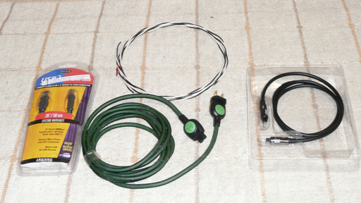 先日の日記「禁断の領域へ」でオーディオの電源やケーブルにもこだわる領域に踏み込んでしまいましたが、今日はこんなケーブル達が届きました。左はベルキン社のUSBケーブル、真ん中上はベルデンのスピーカーケーブル、真ん中下は非メッキメガネ電源ケーブル、右は光デジタルケーブルです。スピーカーケーブルは先日交換したばかりなんですが、以前ご紹介したように今はスピーカーを4つ使って「ナチュラル・サウンド復元法」の構成にしていて、実は前回交換したのはメインスピーカーのケーブルだけだったので、今回はまずサブスピーカーのケーブルをメインスピーカーと同じ物に交換してみました。あと、せっかくなので半田にもこだわってみて、楽器用として評判のKester 44というものを使いました。結果、音の広がりが全然別物になってビックリ。何と言うか、目の前に音楽空間が広がっている感じで、また、音が止んだ時には静寂が感じられて何とも言えず気持ちよい音になりました。正直サブスピーカーのケーブルでこんなに変わるとは思っていませんでした。次に変更したのはUSBケーブル。もちろんMacとUA-25EXの間の接続用です。にわかには信じられないのですが、USBケーブルでも音が変わるということなので、理屈はともかく実際に体感してみることに。これまた確かに音が変わりました。中音域が豊かになった感じでぐっと迫ってくる感じです。デジタルケーブルは長さが大敵ということらしいので、試しに2mくらいのケーブルでも聴いてみましたが、そちらは音がざらついて聴き心地の悪い物になってしまいました。これではUSBケーブルで音が変わるということを信じるしかないですね。次は光デジタルケーブルです。使ったのはDR.DACでおなじみのAUDIOTRAK社のものです。結果は・・・・今日三度目にして最大のビックリでした。広がりが更に増した上に、楽器の音がリアルになって、演奏している姿が目に浮かぶようです。特にギターの弦を強く弾いた時の感じがよく出ていて、ギター好きのわたしには嬉しい変化でした。そんなわけでわずかな間に三度もビックリしてしまったわけですが、ビックリ度合いを数字で表すと、順に3,1,4といったところでしょうか。最後は電源ケーブルです。前回はテーブルタップを変更したので、今回は電源ケーブルに着手することに。ターゲットはHDDレコーダーのRD-X6です。電源ケーブルがあまりにも貧弱なので換えるしかないなと。上が今回購入した物で、したがRD-X6のものです。で、交換した結果、画像の色が濃くなって音も良くなったように思いますが、事情があって映像観賞用のモニターを替えたばかりで、音もついさっき変わったばかりなので変化がよく分かりませんでした。一番先に電源ケーブルを試してみればよかったですね。明日はスカパー!のチューナーで試してみようと思います。といった感じで最近いろいろやってますが、幸いなことにいいサイトに出会えたおかげでオーディオ地獄に陥らずに着実に良い方向に向かっているように思います。明日か明後日にはまた新しい機材が届きますので、またレポートします。