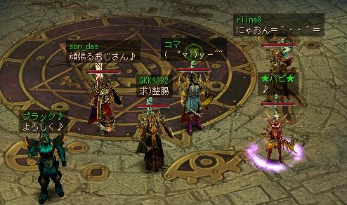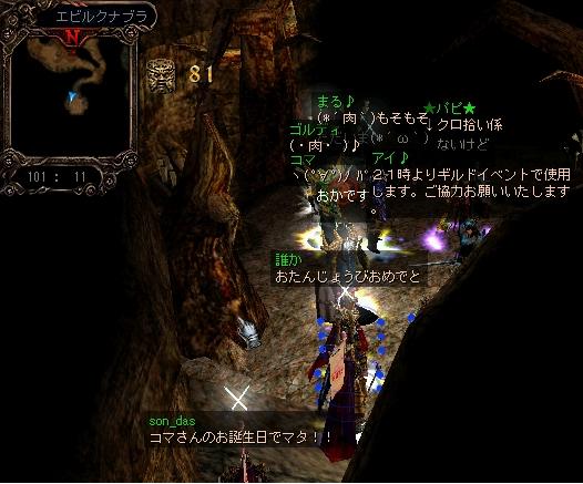 コマさんの84回目の誕生日を記念しての「エビルクナブラにマタリエルに挨拶に行こう」ツアー無事終了しました。(^-^)//""ぱちぱち ということで、(省略)いきなりエビルクナブラに到着戦闘開始です^^v「まずシュレーダーを」とと思いきや・・・・あと一匹でsonさん回線落ち~~とりあえず、続けてくださいということで・・・と無事撃破♪♪v(⌒o⌒)v♪♪イエーイさぁスレイドというところで・・・自分が回線落ち・・・orzそして戻ってみると~~マタリエル登場!!しか~し撃破ならず・・・ザンネン><クロノス城に戻って、コマさんへ皆さんから誕生日プレゼントを贈りました。ハイ、プレゼント 。∠(o・_・)/由ということで、無事イベントは終了しました。コマさん、誕生日おめでとう^^b----------------------------------参加していただいた方々に(^人^)感謝♪sonさん、バフォさん、リナさん、まるさん、ゴルディさん、誰かさん、儒慈さん、パピさん、アイさん、トラメさんありがとうございました~~♪