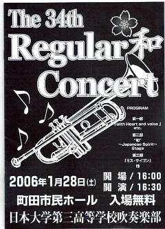 昨日1/28(土)に町田市民ホールで日大三高吹奏楽部の第34回定期演奏会がありました。毎日毎日休み無く学校に通い一生懸命練習した集大成ということで。。凄い良かったです。OB OGのたくさんの方々も参加されて一緒に吹いたタイガーラグではホントに感動モノでした。大先輩の昨年亡くなられた石野さんに捧げられたのですがきっと喜んで下さったと思いますよ。本編最後のサライでは高校2年生の先輩方が紹介されたんですけど実質この演奏会で引退となるのでみなさん涙、涙で。。。サライの曲に泣かされて次のアンコールはWE ARE ALL ALONE。。。。反則ですよ~~~。オーラスはコパカバーナでしんみりした雰囲気を一掃して楽しく終わりました。それにしても吹奏楽部って一年中忙しい。四月の入学式(中学、高校)、新入生歓迎会、春季野球大会応援、関東大会応援、高校体育祭、夏季野球大会、甲子園応援、文化祭、中学体育祭、秋季野球大会応援、アンサンブルコンテスト、定期演奏会、卒業式式典演奏(高校、中学)。。。。休む暇なんて、、、勉強いつするの?ってかんじですよね。(笑)きっと夏にある吹奏楽コンテストとか出たいんだろうなぁ。でも毎年野球応援等が重なって出てないみたい。仕方ないですよね。演奏会には硬式野球部の部員が裏方としてお手伝いしてくれていたみたいです。来場したお客さん達も野球部のみんなを見てちょっと嬉しかったみたいです。でも。。。今日の主役はいつもスタンドで汗を流している吹奏楽部のみんなです。凄い格好良かったよ!!また、次の予定に向かって頑張れ~~。そして高2の先輩達。。。あと少し卒業式式典までみんなの面倒見て下さい。お疲れさまでしたvv