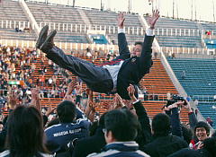 。。。。。桐蔭負けちゃいました。。12-36でした。伏見工おめでとうvv しかし伏見凄いな。全然途切れなかった。桐蔭の方が体格的には勝っていたけど。でも桐蔭も頑張ってた。2年生も5人残るし来年また見せてくれるでしょう。頑張れ!って言ってしまうけど極限まで頑張ってる人に言ったらいけないよね。。凄かったよ。。みんな。伏見の主将杉本君は進学後はラグビー続けないんですって。将来はIT関係の仕事がしたいそうで。。。彼ならいろんな所から誘いが有ったと思うんだけど。今日がジャージを着る最後の試合だって。。。。良かったねvv最後が日本一だよ。