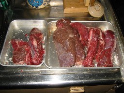 1週間ほど前に、捕ったばかりの鹿の肉を頂きました。さしみで食べるのもいいですが、今回は燻製にしてみました。写真のように、胡椒をして、粗塩をたっぷりすり込むようにします。冷蔵庫で3時間ほど置き、それから燻製にかけます。3時間ほどで出来上がります。これは、本格的なやりかたではありませんが、十分に美味しいです。