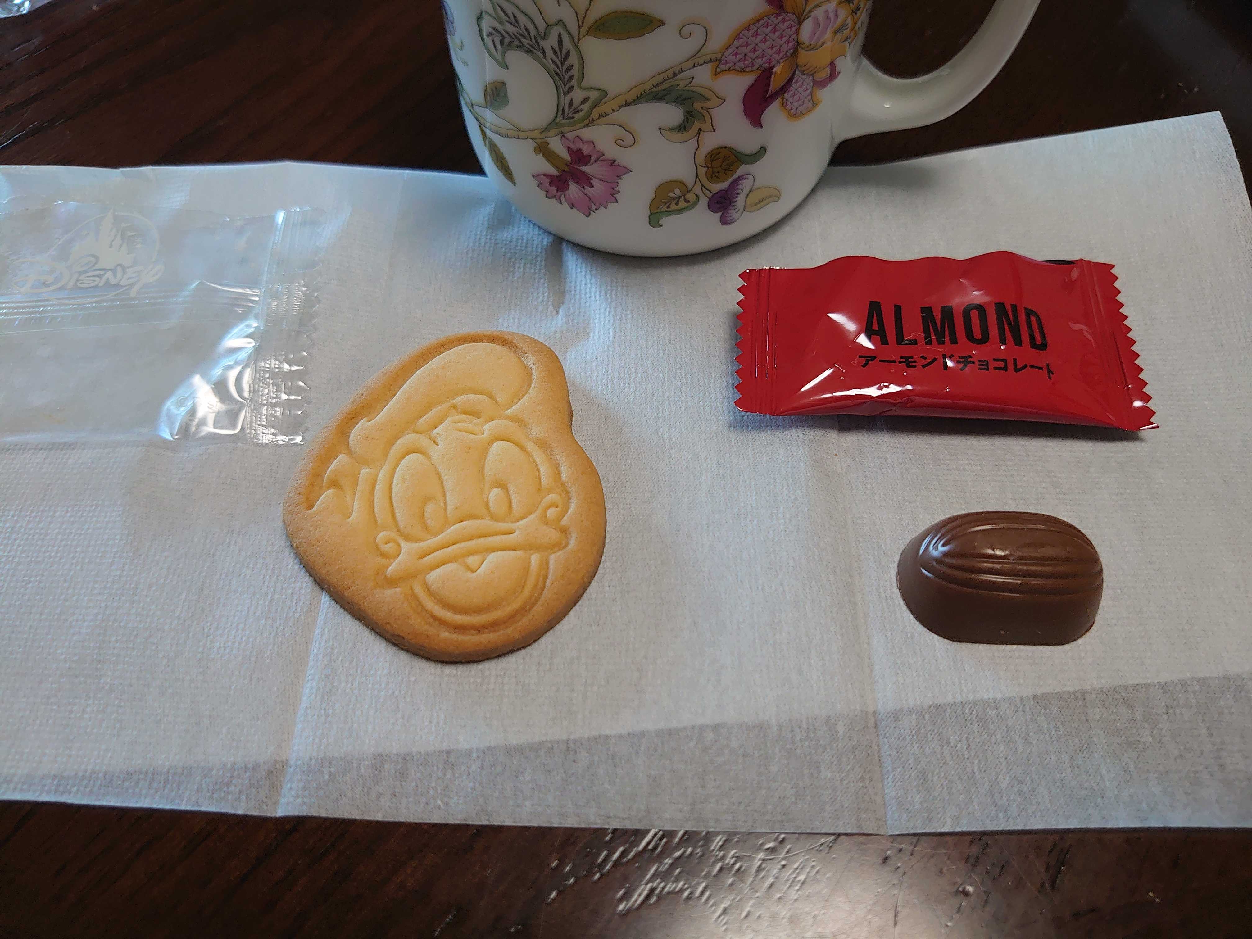 ドナルドダックのクッキーとアーモンドチョコレート。