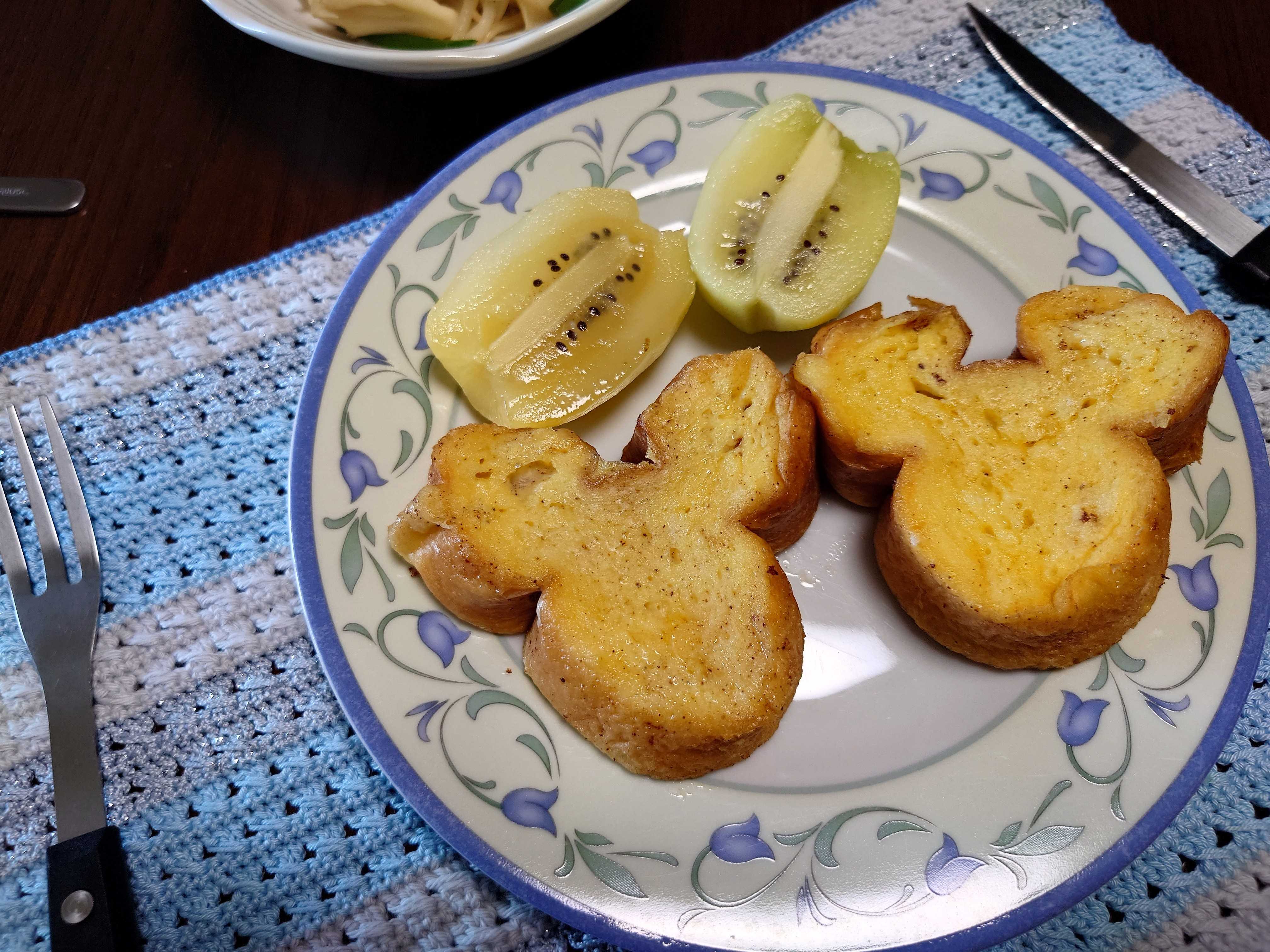 ミッキーマウスのロングパンの「フレンチトースト」とグリーンキウイとゴールドキウイ。