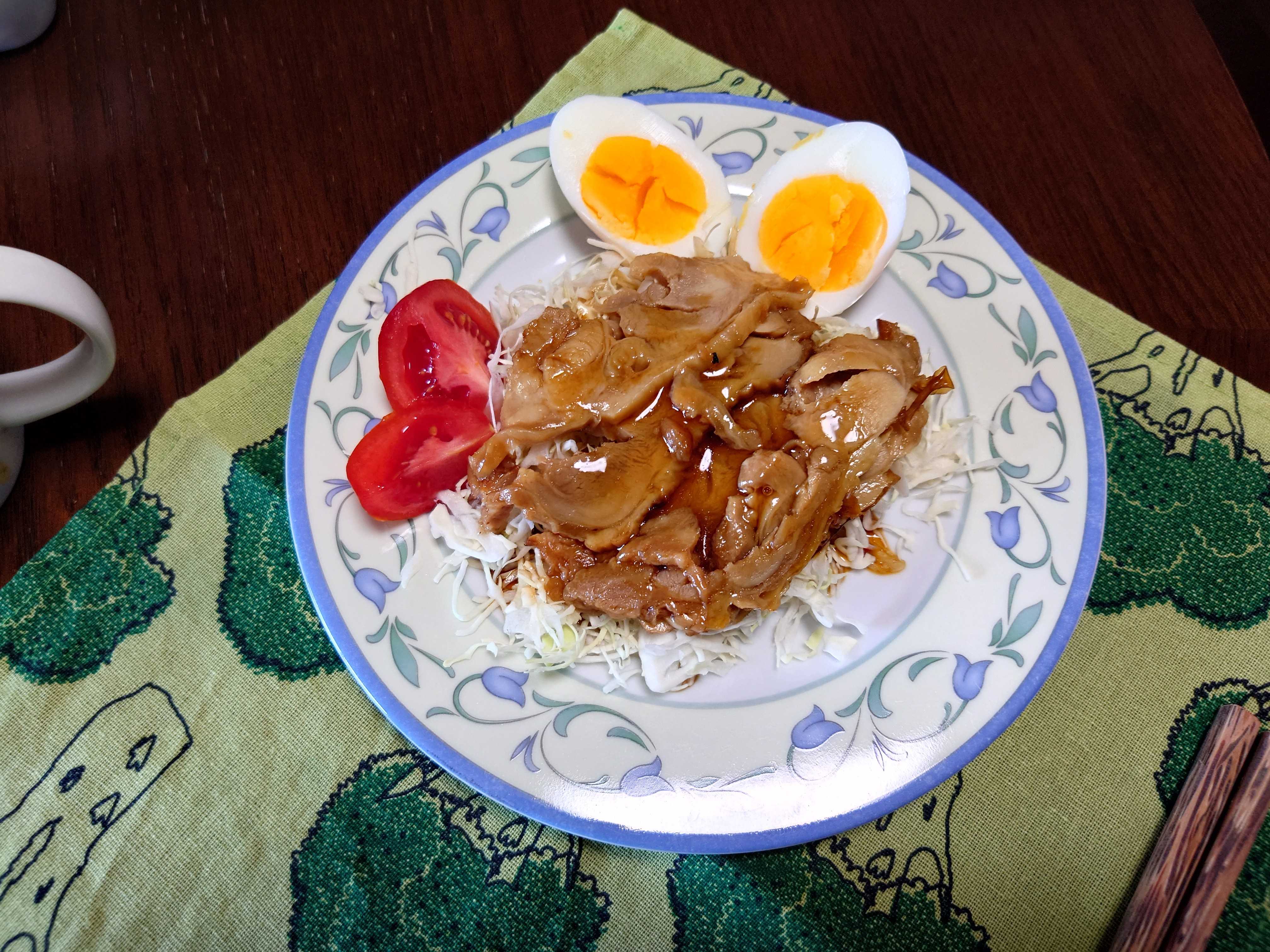 千切りキャベツと蒲焼き鶏、ゆで卵、ミニトマト。