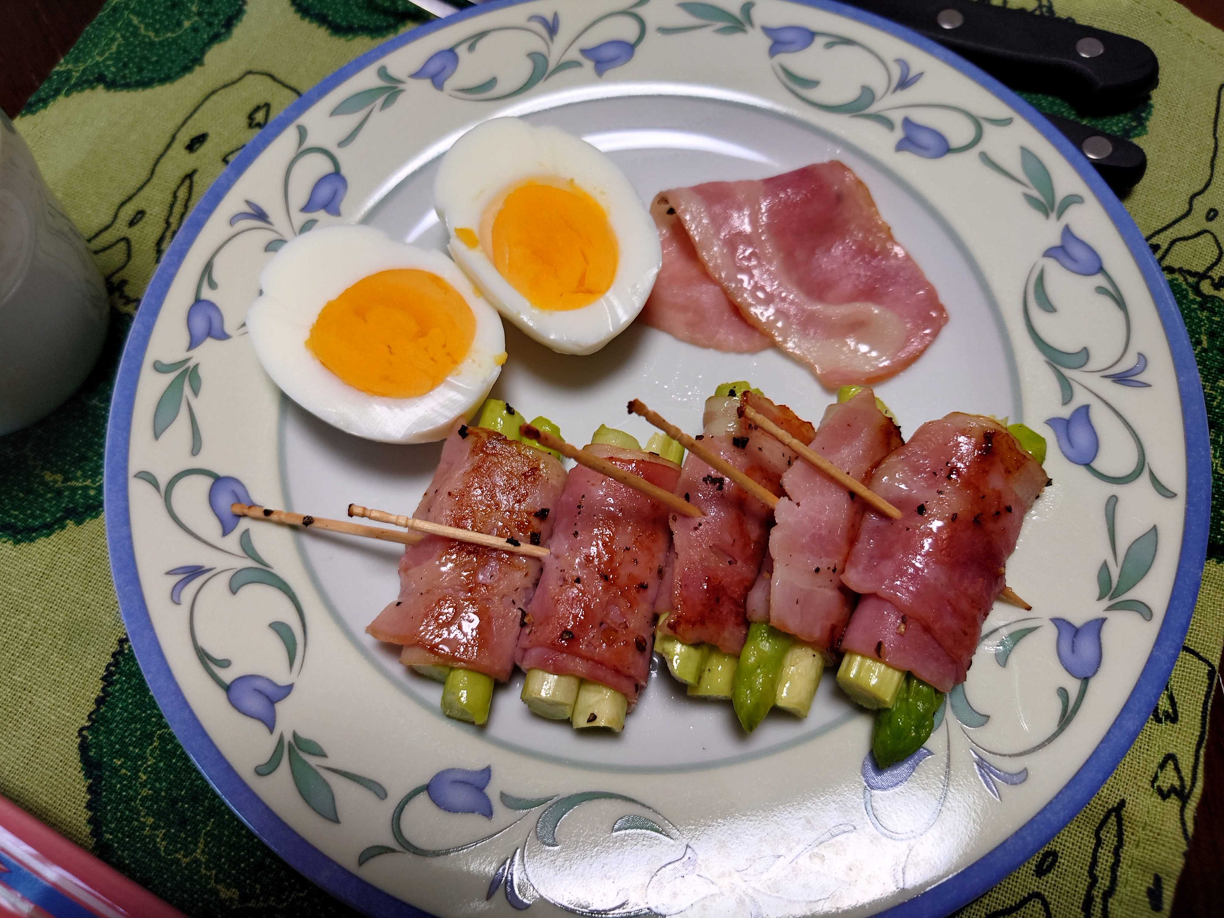 アスパラのベーコン巻きとゆで卵。