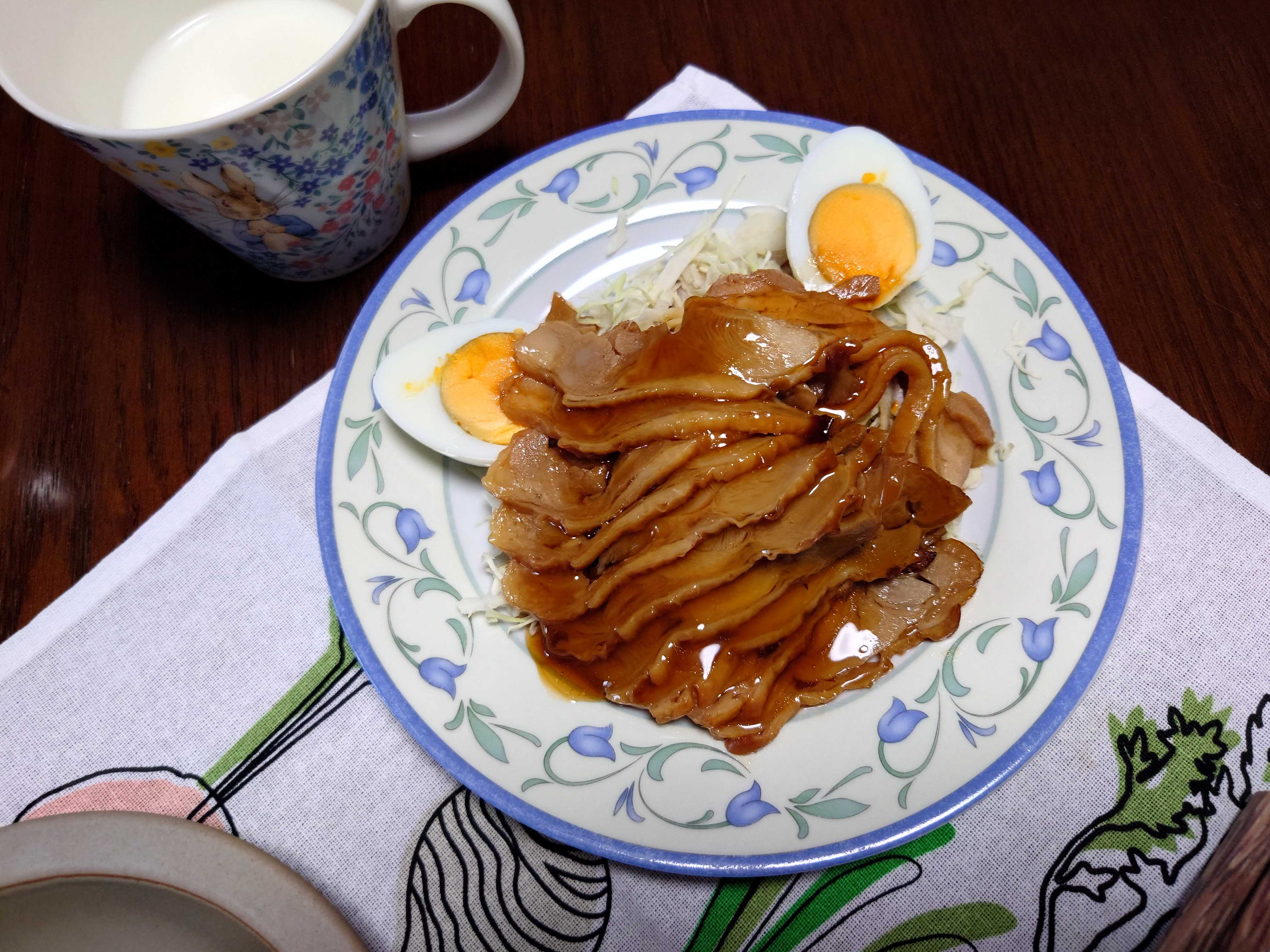 蒲焼き鶏と千切りキャベツとゆで卵。