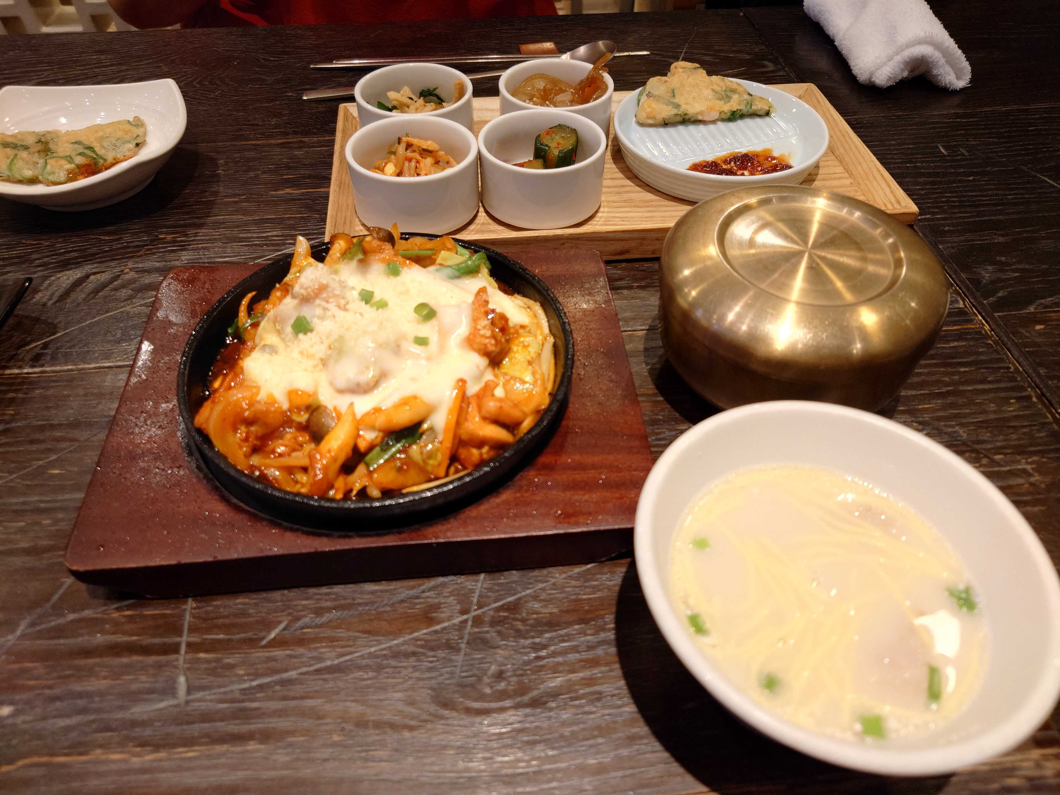 チーズタッカルビランチセット。手前は、ランチセットについてくる「コムタンスープ」。