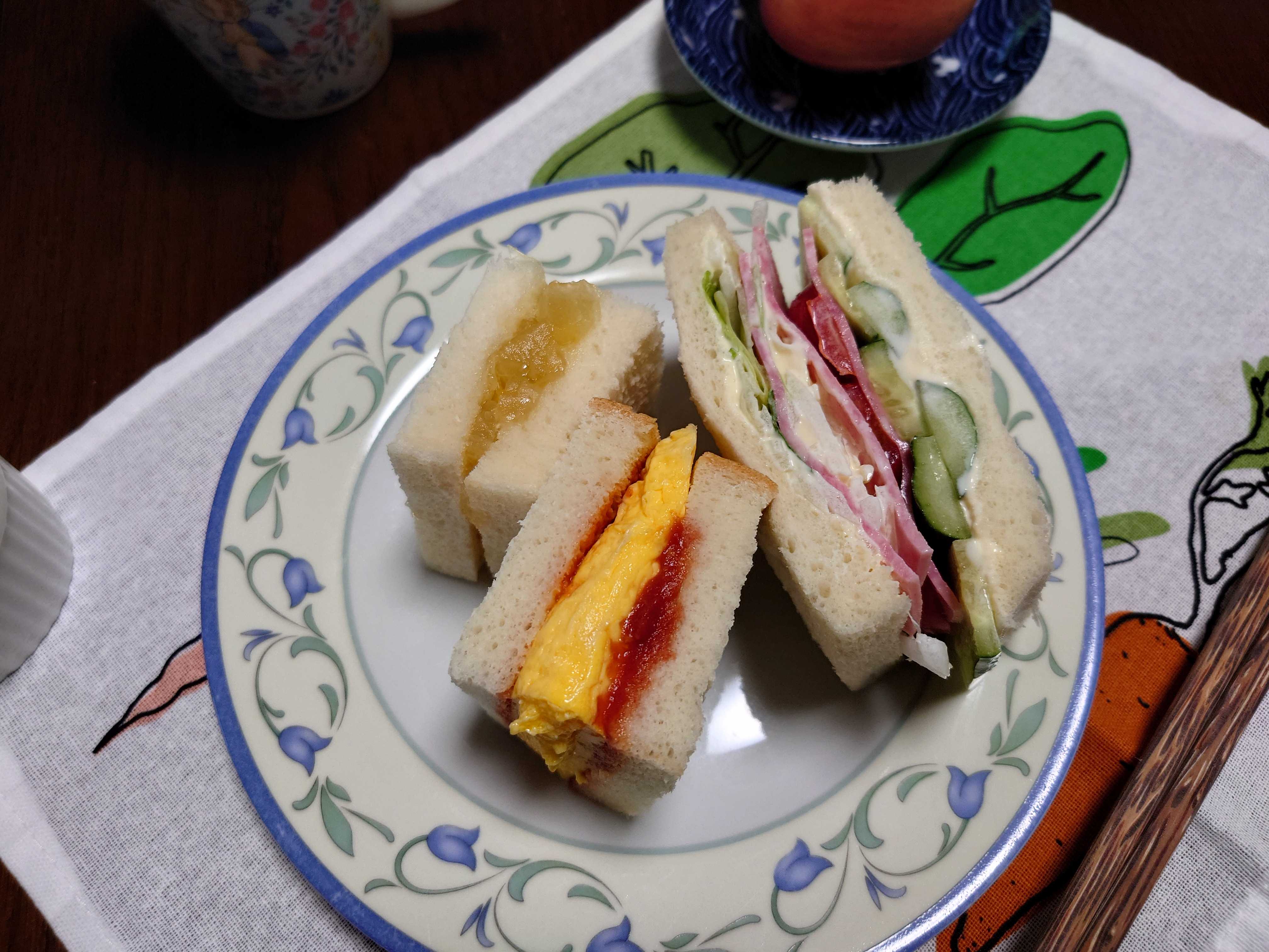 ハムサンド、たまごサンド、鬼柚子ジャムサンド。