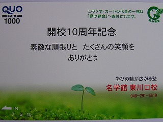 名学館東川口校は、開校10周年を記念し、 現在、様々なキャンペーンを実施しています。 この写真は皆様にお配りした「10周年QUOカード」ですが、 使われましたでしょうか。 4月末の段階で在籍されていた方へは郵送しているはずです。 他に以前に在籍していた卒生宅にも、今回かなりお配りいたしました。 もう何年もお会いしていない方もおられましたが、 この地元で小さな塾がここまで頑張れたことへの、 皆様に対する感謝の気持ちとして、送らせていただきました。 ご利用いただければ幸いです。 さて、このたびの「開校10周年記念」のサービス・特典のうち、 「ご紹介キャンペーン」が7月10日にて終了になります。 用紙を保管されたままになっておりましたら、 ぜひもう一度目を通し、お考えいただければと存じます。 ちょうど今、中学生なら期末テスト前なので、 「体験授業」や「テスト対策」も大変有効です。 部活総体の結果も出てきて、受験生たちも本腰を入れるときです。 受験生も含め、今年はまだ全学年受付中です。 もし、お知り合いやご家族(下のお子様)で参加希望があれば、 お早めに声を掛けてください。 今だけの大変お得な特典をご利用いただけます。 テスト対策につきましては、未入塾でも参加できますので、 まずは遠慮なくお申し出ください。 10周年の他のサービスにつきましては、 次回まとめてお伝えいたします。