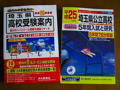 またこの2冊と付き合う時期ですね。 受験生のご家庭では、もう新版は購入されましたか。 写真左は毎年教室に常備している「声の教育社」の受験ガイドです。 右はおなじみの公立入試過去問です。 平成25年の文字を見ると、いよいよ迫って来たなという感じですね。 書店に行くと両方とも積まれていますので、 まずは受験ガイドだけでも先に購入されることを、お勧めします。 各社色々なタイプがありますので、 使いやすそうなものでいいでしょう。 受験ガイド購入の大切さについては、 後ほど書きます。