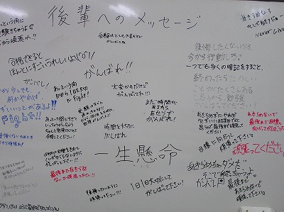 決起集会では色々なことを語った。 今しかできないこと、心得て欲しいこと、守るべきこと・・・ メモ書きしている者もいたが、ただ控えるだけではなく、 「なるほど」「そうか」という発見を、今こそ大切にして欲しいと思う。 踏み込んで行動を決めていくのは、君たちの決意だ。 みなから誓いの言葉も受け取った。 受験生として、いよいよ本気を刻むとき。 俺の、私の本気がどれくらいかを見せるときがやって来たのだ。 もう迷うこともなく、自分に投資できるだろう。 君自身が刻んだ決意表明の言葉をぜひ大事にして欲しい。 先輩たちが残したメッセージ。 君たちのために書き込んでくれたものだ。 合格を誓い合う節目の日に、 みなの前で一つずつ消していった。 先輩の熱い素直な想いを、受け止めてくれたかな。 次は君たちの番だ。 桜の咲く頃、このボードに格好いいメッセージを残そう。 先輩から受け継いだバトンをしっかり握り、 ゴールまで走り抜けよう。 10期生たちの残り3か月の記録は、これからだ。