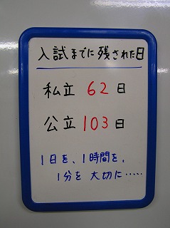 12月8日(次の土曜日)に中3受験生を一同に集め、 受験に向けた決起集会を行う。 毎年、名学館の受験生たちが受験の本番に踏み込む「登竜門」として、 互いに確認し合い、誓いを刻む集まり。 今まで何人もの先輩たちがここで気合を入れ、後のスパートの嚆矢としてきた。 とても意義のある集会なので、きっちり出席していただきたい。 案内は暫く前に生徒たちに直接渡した。 出席票の提出期限は5日となっているので、忘れている者は急ごう。 当日は、残り3か月弱をどう仕上げていくかの大切なシミュレーションを行う。 カウントダウン期に効率良く力を付けていくための方法論を与え、 すべきこと(〇)と、してはいけないこと(×)を、 共通認識のもとではっきりさせる。 ただ集まるのではなく、 「絶対に合格するぞ」という気合を持って集合されたし。 当日は、宿題の調査シート(記入済のもの)と筆記用具を忘れないように。 入試までのカウントダウンも日々進んでいる。 設置初めに撮った写真。 撮影からすでに13減った・・・