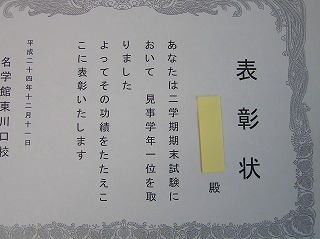481点。 学年1位が出ました。 戸塚中1年生、Mくんです。 1学期の中間ではあと2点で惜しくも2位でしたが、 今回は低い平均点の中、 素晴らしい得点で見事に1位獲得です。 これで今年は3年生のMくんに次いで、 塾から2人目の学年トップ誕生です。 戸塚西中、戸塚中の地元2中学から、 年内に揃って1位が出たことになります。 それぞれ学年約300人ですから、凄いことですね。 名学館の名前も少しは広まるでしょうか(笑) 戸塚中1年の期末の学年平均は289.8点でした。 なので彼は平均よりも200点近い得点を叩き出したことになります。 正確には191.2点差ですが、 これは恐らく開塾以来最高値でしょう。 1年生なので、メモリアルとして賞状をプレゼントしました。 今後の頑張りへの励みにしてくれたらと思います。 なお、戸塚中1年生の塾平均は361.4点。 学校平均に対して「+71.6点」でした。 戸塚中全学年の塾平均も368.6点と、 低い学校平均に対してかなり高い得点でした。 およそ「+60点」前後が出ているでしょう。 選抜試験など一切ない塾ですので、 平均としてこの結果が出ているということは、 塾生たち一人一人が頑張っている証拠ですね。 成績結果が関係しているのか、ここのところ、 保護者様からの問い合わせも増えています。 名学館は大人数で進める塾ではありません。 指導方法、生徒の様子、教室の空気など、 興味のある方はお訪ねください。 教室はすでに学年末に向けて動いています。 やればここまで極められるというMくんの記録を励みにし、 笑顔を大事にしながら、 全員で頑張っていこう。