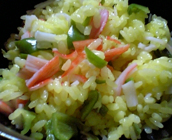 みんな・・・・お元気?アタシ、サンマリエよ♪今夜はさ、早く帰れたのよ。だからさ♪アタシもあの子気取って♪真似してサフランライス・・炊いたの。どうよ?みたひとはうまそうとかなんとか言って頂戴!!!!サフランライスって、いいわね♪気持ちも明るくなるし、なによりこれ4杯食べたわよ。カニのかまぼこいれてみたの♪ちょっとの量で黄色になるから、つくるんなら、みんな気をつけてちょうだい!よくばっていっぱい、入れると、アンタ、サフランライスどころかドライカレーになるわ♪さあさ、マリーんとこ、いって、コメいれなきゃ♪いそがし♪いそがし♪じゃあね♪