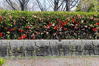 今朝は少し冷え込みました空は青空のすばらいい天気外出先で珍しい鳥を見つけましたヒヨドリではないと思います撮影が悪く見にくいです赤い花は「ボケ」です
