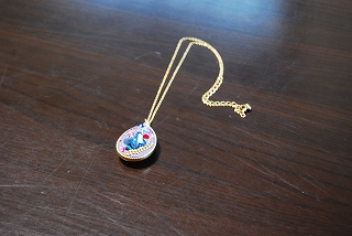 妻が文化教室で作製しました作品名は「ジュエルDeCoReネックレス」ですいろんなストーンを張り付けています細かい極小のストーンが多く作業は大変のようでした