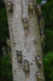 今日も猛暑の日36度を超えており屋外は怖い状況ですところで今年はセミの鳴き声が特に多いように思います我家の庭木にセミの集団がとどまっています写真を撮りました