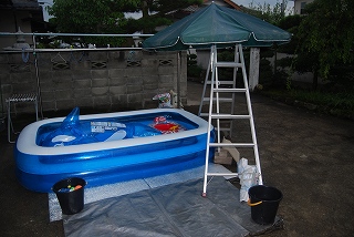 今日も天候が今一つすっきりしません雨が降ったりやんだりそれでもめげずに孫たちにプールを準備しましたなかなか空気が入らず汗だくの疲労困憊何回も休憩しながら汗ふきふきやっと完成し可愛い孫2人がプール遊びにんまり嬉しい満足感写真は完成後の夜の撮影です