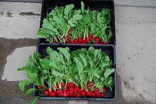 ラディシユの収穫今年は実に虫が来ず綺麗に出来ました残念なのは葉っぱに虫が穴を開けてしまいましたサラダに美味しいです
