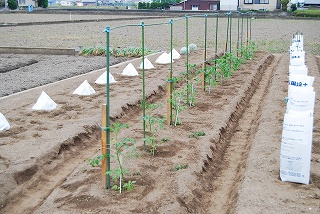 昨日はカボチャの植付けに専念やや土がごろごろしており土寄せに苦労しました植付前に穴を掘り肥料と水を施しある程度土入れをして本番の移植をし更に水かけをしてから紙製の袋で苗を覆います暫くこの状態で見守ります写真の左奥に写っている白い袋が完成品です写真中央はトマトの苗です大分大きくなりました