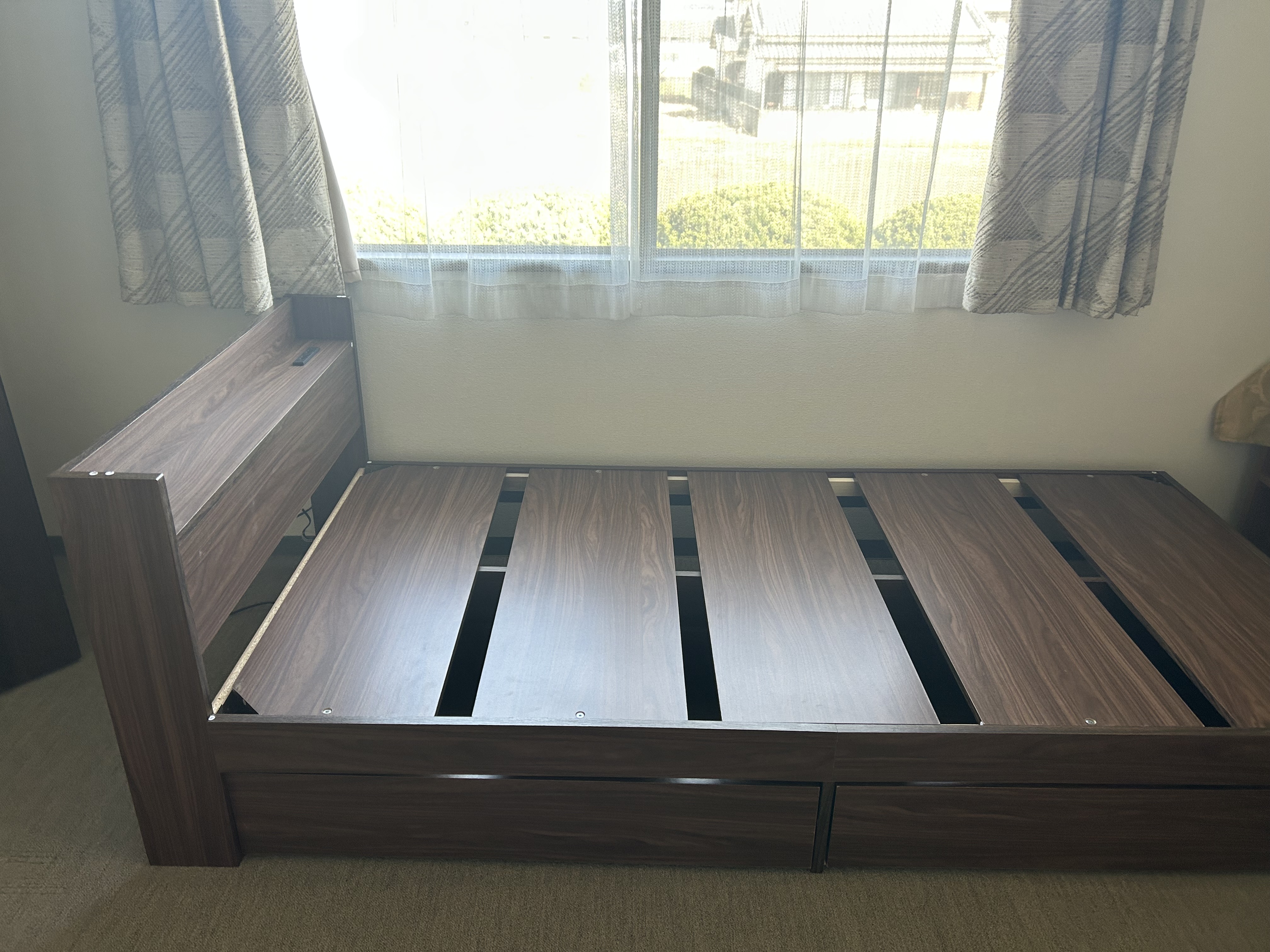 昨日は通販で購入したベッドが届く3つの段ボールで梱包されていた早速組み立てに掛かる慣れないことでまず第一の失敗は各梱包の段ボールを無造作に切り開け各種部品の板・付属品・説明書を取り出しましたそれらを寝室に運び込みいざ取り掛かると板と付属品がAグループ・Bグループに振り分けられていたのと組み立て順に部材が並んでいたのにきづかずまず反省する説明書の順番に徐々に組み立てを進めていたら一か所上下反対に取り付けているのに気が付き修正しようとしたら特殊な「ねじ」関係部が外せなく取り付けに必要な穴を正規の反対側に作って組み立てを進めることに初日はそこまでで作業中止する今日朝から再チャレンジし説明書と部材・付属品をにらみながら約3時間で完成妻と二人笑顔で感動しました疲れがどっと出ました高齢者には複雑な組み立てはとても大変でしたもうこのような買い物はしないと妻と二人で誓った