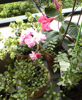 右上の赤いのは、マンテビラっていうゴージャスな蔦性の花。