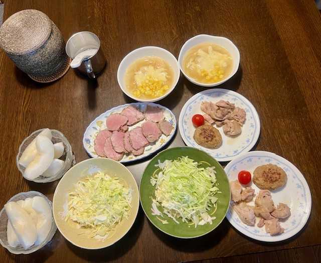 夕食は、ミニハンバーグ、鶏の味塩胡…