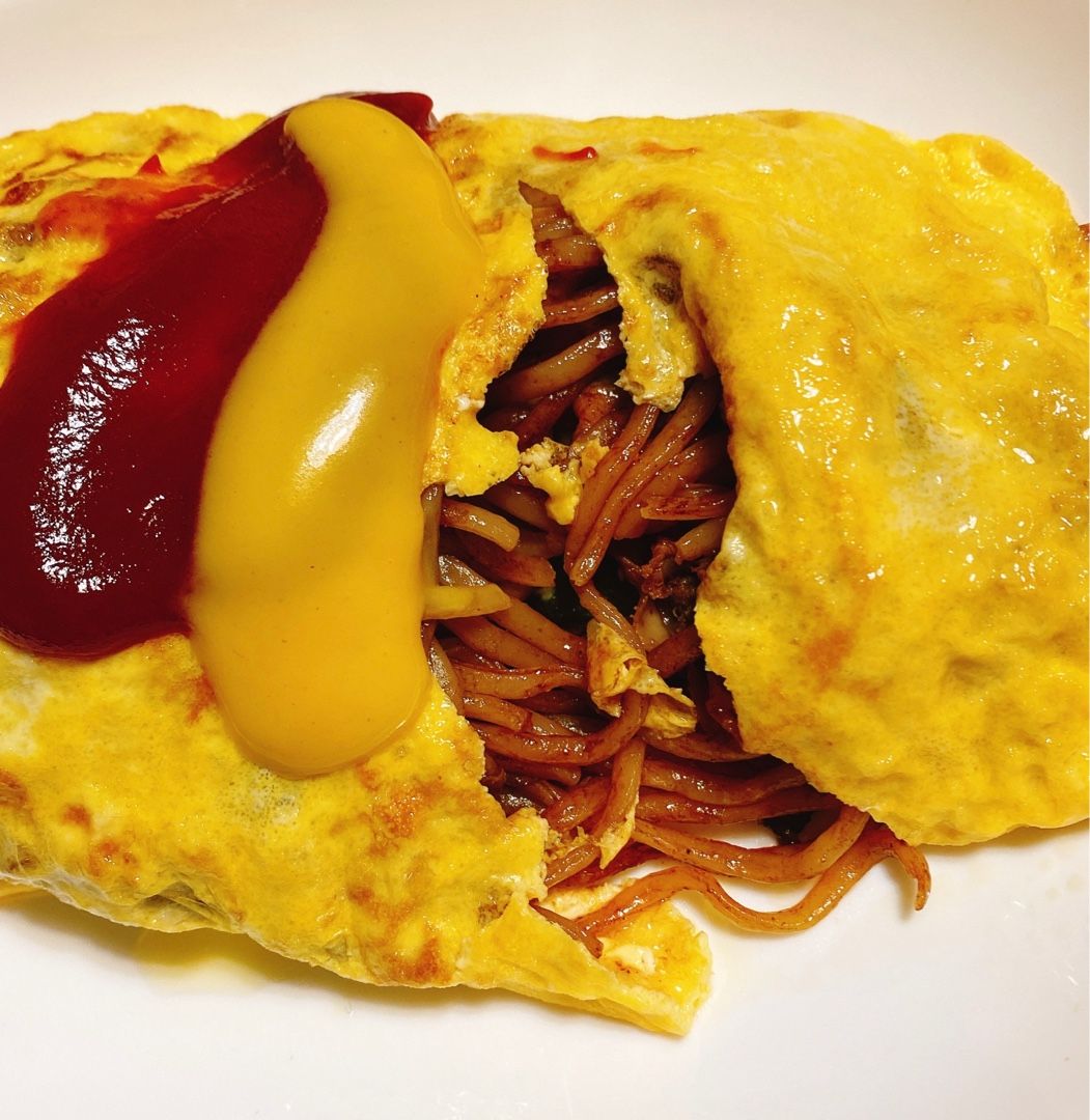 焼きそばの具にはホタテも入って、ちょっと豪華なオムソバの出来上がり!