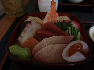 街中の和食屋さんで戴いた海鮮丼16豪ドル。 昨日の対円レートが約80円として1300円弱、 今どきの日本だったら(場所によっては)半額で食べられそうだ。 ……なんてボヤいたところで ここはゴールドコーストなんだから仕方ない。 と開き直り、 せめてものツグナイってことで(?)補正してみた。 ……ちょっとは美味しそうに、なった? もっともゴールドコーストには咲かない千葉、、、 え゙っ? ……そっか、「さかないちば」って入力したから・こうなったのね。 f^^; 正しくは「うおいちば」で魚市場と変換されることを予測してたため 咲かない千葉には・ちとビックリ。 f^^; ……ってか「さかないちば」だなんて、 かなり日本語がヤバくなってるかも。 f--; で、 ゴールドコーストには魚市場がないため これだけの種類の刺身を一般家庭で手に入れるのは不可能。 ……もしかしたら私が知らないだけ・かもだが、 とにかく貴重な店である。 ツイデと言っては失礼だがツイデに・この海鮮丼、 寿司飯とネタの間に味つけしたカンピョウが散らしてあって、 そのお陰で・ご飯を残すツモリだったので 美味しくで残す気になれず。 …………完食、 ああ・あり得ないことを成してまった。 f--;