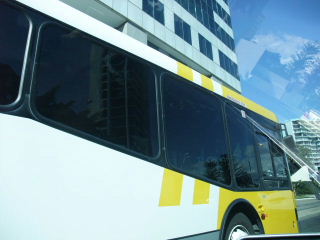 そういえば ゴールドコーストに来て当たり前になってしまってるけど。 ただの(失礼っ)路線バスにして・この窓ガラスの黒さ。 ……恐るべし紫外線・大国。 f--;