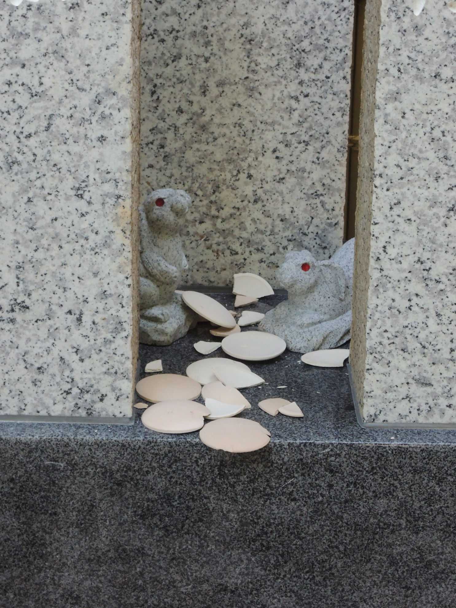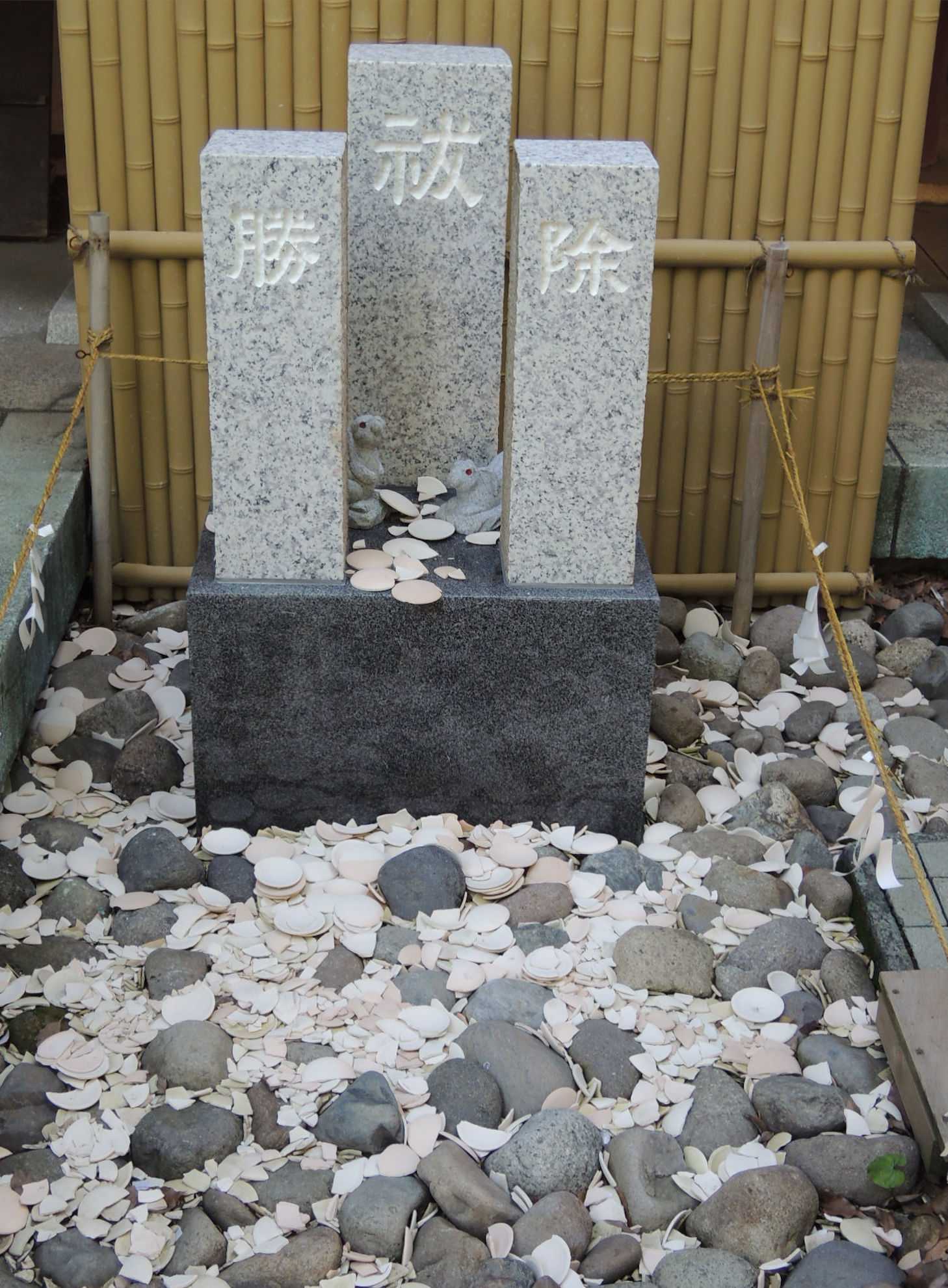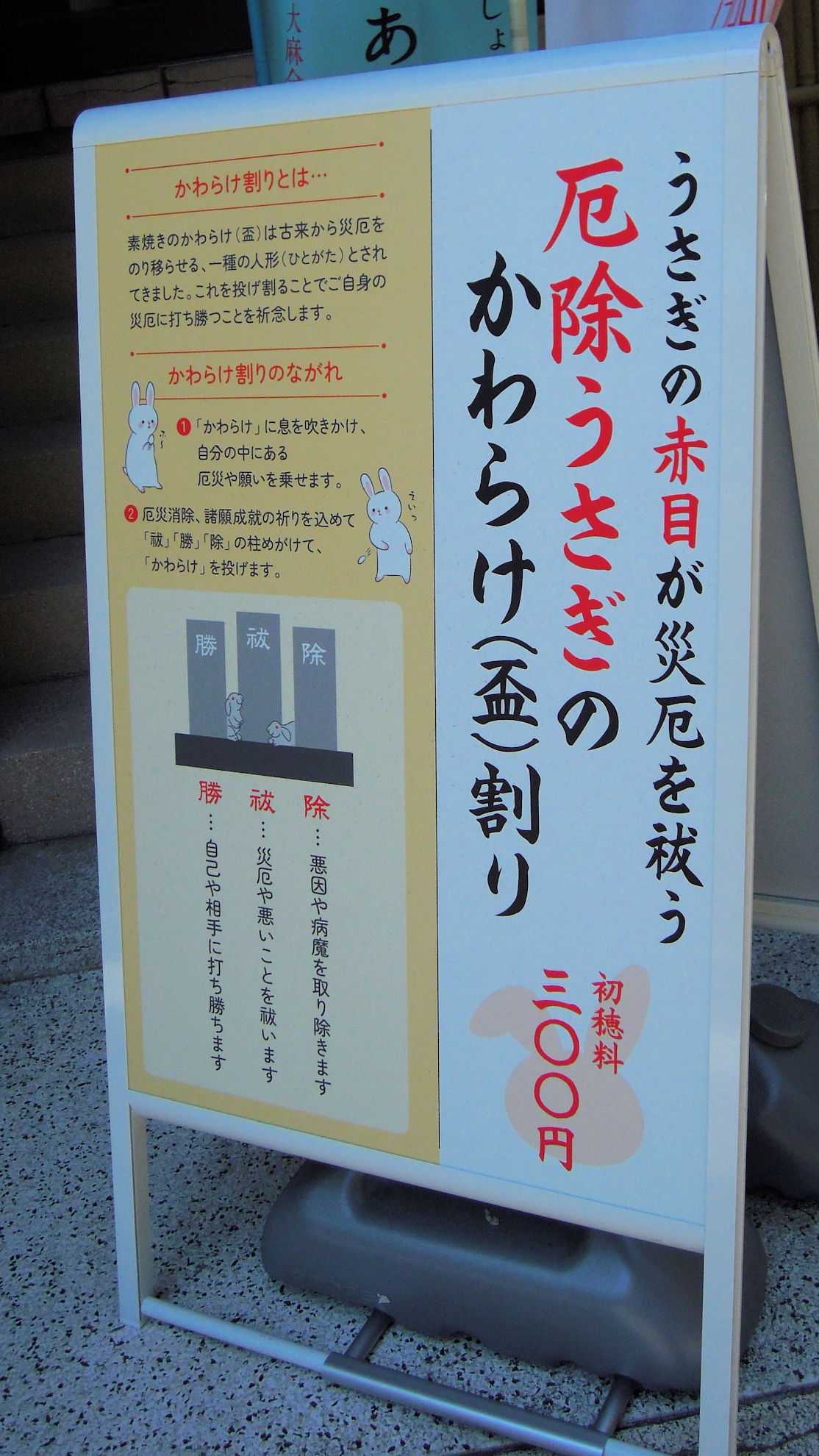 社務所で頂ける素焼きの皿に自分の厄をこめ石にぶつけて割ることにより開運するもの