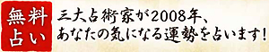 明けまして、おめでとうございます。本年もよろしくお願いします。2008年の私の目標は、ゴルフのスコアで「100」をきることです。昨年も同じ目標でしたが、達成することができませんでした。今年こそは、「100」をきりますよ!新年といえば・・・運勢ですよね。2008年の気になる運勢を三大占術家が無料で占ってくれるサイトがあります。あなたの2008年の運勢はどうかな?ちなみに、鏡リュウジ先生の占いによると、私は「すばらしい一年」となるとそうです(笑)▼無料占い 三大占術家http://special.fortune.yahoo.co.jp/special/unsei_2008/index.html