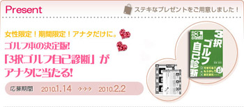 女性(レディース)、ジュニアのための口コミゴルフサイト Golfy(ゴルフィー)では、2010年2月2日(火)13時まで、ゴルフ本の決定版!『3択ゴルフ自己診断』を抽選で1名様にプレゼント中です!ゴルフの基本からルール、マナーまでが、この『3択ゴルフ自己診断』でわかります。内容は、○×△の3択方式なので誰でも簡単に学ぶことができます。例えば、練習場編(左手のグリップ「左手のナックルがいくつ見えますか?」/右手のグリップ「右手にできるY字はどこをさしますか?」などなど、気になる情報が満載!ビギナーの方にはオススメのゴルフ本です♪ご応募はGolfy(ゴルフィー)から↓ゴルフ本の決定版!『3択ゴルフ自己診断』をプレゼント!https://www.golfy.co.jp/campaign/index.php