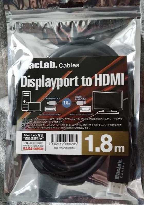 PC本体にDisplayPortかVGAしかないのにモニタはHDMIとVGAしか空きがない!と困っていたところにこれを見つけました。MacLab.DisplayPort to HDMI 変換 ケーブル 段ボールから出すとこんな感じ開けるとこんな感じ端子がHDMIとDisplayPortになっています。少しケーブルは太めですねDisplayPortは入力側(PC)HDMIは出力側(モニタ)でしか使えないので注意です一応購入ページの注意書きを転載しておきます。(※1)PC側のHDMIからモニター側のDisplayPortへは変換できません。(※2)オーディオ変換(音声出力)に際してはご利用のOSにて「サウンド設定→音声出力先」の設定にて音声出力先機器をご選択頂く必要がございます。(※3)ご利用されているグラフィックボードや液晶モニターによってはHDMI自動検出の設定が必要になります。詳しくはお手持ちの製品に付属しているマニュアルをご参照下さい。(※4)HDMI変換ケーブルのため、DisplayPortのデイジーチェーン機能には非対応です。聞いたことのないメーカーでしたが無事モニターに映り問題なく動作いたしました。世の中困ったときは検索すれば誰かが解決策を作っているもんですねいい時代です。【ランキング1位獲得】DisplayPort to HDMI 変換 ケーブル MacLab. 1.8m ブラック DP ディスプレイポート 変換アダプター hdmiケーブル ミラーリング テレビ 相性保証付 |L価格:1,399円(税込、送料別) (2023/3/26時点)楽天で購入