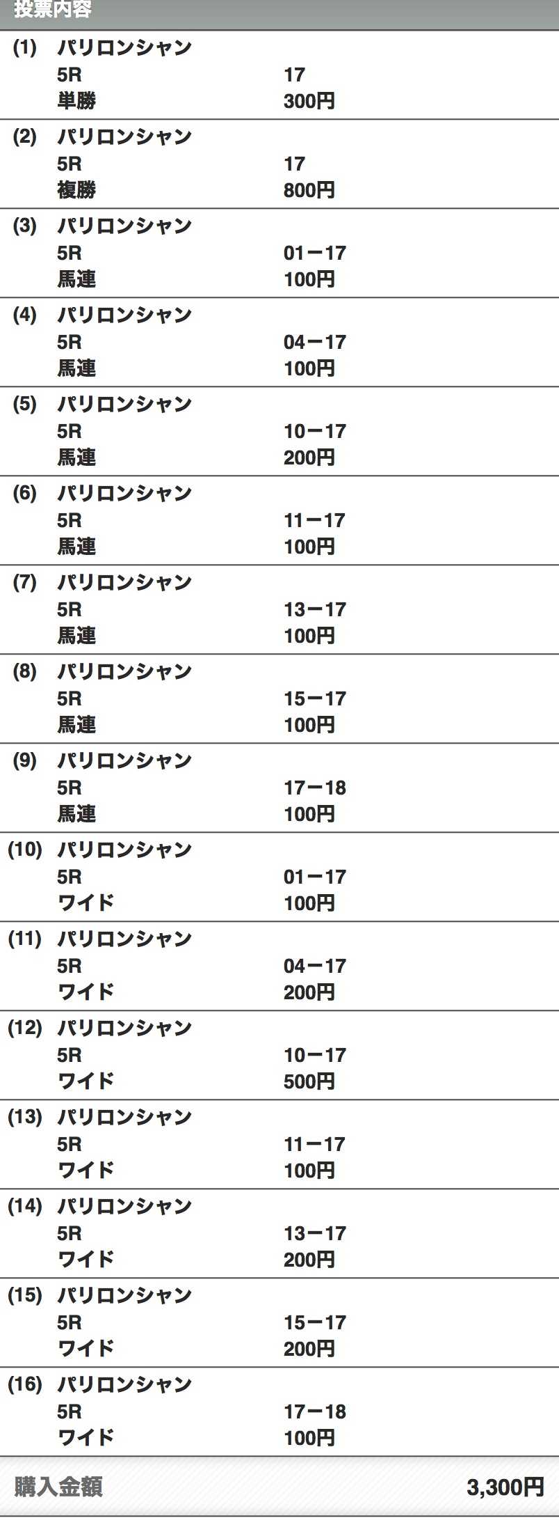 ◎17 ミニーホーク ◯10 アヴァンチュール ▲13 クアリフィカー ★15 クロワデュノール △01 ジアヴェロット △04 ソジー △11 ダリズ △18 ゲゾラ予想とは別に日本馬が来たならそれはそれとして喜べるので良い。