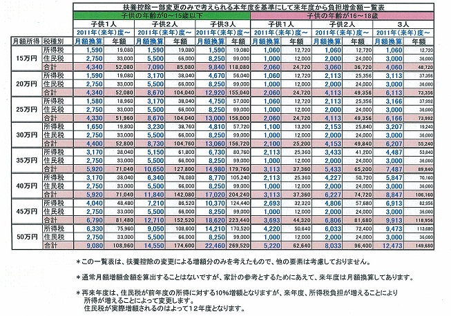 今日も前回から引き続いて、扶養控除一部廃止でどうなるか?というものを一覧表にして作成してみました 今後、子供手当などと比較したいので、扶養控除がかわる年齢だけあげ、また、その子供の人数別に算出しております。下の表が見えにくい場合はこちらをクリック <参考資料として>★0~15歳の子供に対する扶養控除完全廃止 所得税 38万円(現行)→0円(来年度) 住民税 33万円(現行)→0円(来年度)★16~18歳の子供(俗にいう税制上の特定扶養親族)は扶養控除減額 所得税 63万円(現行)→38万円(来年度) 住民税 45万円(現行)→33万円(来年度)★19~22歳の子供の扶養控除変更なし 所得税 63万円(現行)→63万円(来年度) 住民税 45万円(現行)→45万円(来年度) このほかにも国民健康保険税は、住民税額をもとに算出されておりますので、扶養控除が廃止されて住民税額が増えればそれだけ税金が増えることになります。今後、こども手当等と比較してみたいと考えています。 実際、今の段階でも、夫婦子供2人、収入が年1000万円世帯で、所得税と個人住民税負担は、合計113万円と収入が半分の500万円世帯に比べて5.5倍というデーターがでています。 それでは、今日はこの辺で 最新情報ついでにお買い物!☆をクリック!!