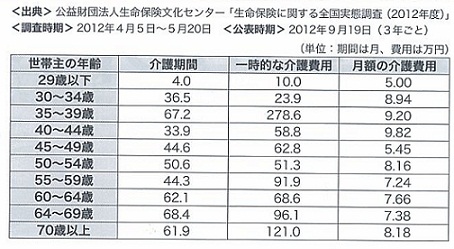 おはようございます今日もファイナンシャルプランナーとして、記事をチェックしてみました!ダウ1万3712ドル、5年1か月ぶりの高値 【読売新聞】2%目標の早期実現を評価、日銀法改正の必要性薄れる=官房長官 【REUTERS】再生へ政府と連携必要 共同声明、日銀の独立性にも配慮 白川総裁の一問一答 【朝日新聞】首相の執念、折れた日銀 物価目標巡り暗闘1カ月 【日本経済新聞】通貨安戦争の先頭走る日本 【読売新聞】「安倍バブルに便乗」はまだ間に合うのか? 【月刊SPA】所得税、「4千万円超」に最高税率...自公民合意 【読売新聞】延滞税、14年引き下げへ 消費増税の負担軽減 【朝日新聞】Google が2年連続で「もっとも働きがいのある企業」に選ばれる-米国 Fortune 調査 【JAPAN INTERNET.COM】米グーグル、10~12月純利益7%増 売上高は最高 【日本経済新聞】晩婚家族の老後設計、教育費・住宅費負担に要注意 【日本経済新聞】野菜高騰 家計悲鳴...寒さで生育遅れ 葉物中心に卸売価格上昇 【産経新聞】参考までに。 さて、今日は介護にかかる期間とお金について目安になる表を掲載してみたいと思います。一連の資料を掲載していくことで、そこから見えてくる問題点と、これから書こうと思っている年金等の老後の問題についてより、深く具体的に見えてくるものがあると考えています。 実際に介護の経験がある方が、どれぐらいの期間、どれぐらいの費用を必要としたのか?その目安を知ることができるのでは・・・と思います。 先日、身体のメンテナンスを仕事としている友人から、教えてもらったのは、「手の平を上にして寝る」というもの。 ついつい、仕事などで、PCなどに向かっている時間が長くなると、知らない間に肩が前に出ていることがあるそうで、そうなると呼吸が浅くなってしまうそう。 そうなってしまっている癖を解消するのに、寝るときは手の平を上にして寝ることで、肩がベットについて、より呼吸ができるようになるそうですぜひ、皆さんも試してみてくださいね! それでは、今日はこの辺で。