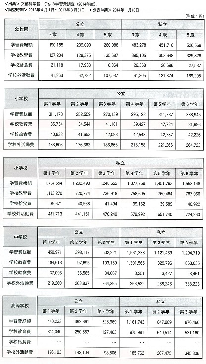 おはようございます今日もファイナンシャルプランナーとして、記事をチェックしてみました!今日の為替はこれで動く 【ZAI】今週の日本株、外部要因にらみで一進一退 決算銘柄への物色も 【ロイター】今日の株価材料(新聞など・9~11日)トヨタ・マツダ、環境技術で包括提携 【日本経済新聞】近づく緩和相場の幕切れ、株は買い場か見送りか 編集委員 田村正之 【日本経済新聞】春闘の賃上げ、恩恵を受けたのは誰なのか 賃上げ幅急拡大に隠されたカラクリ 【東洋経済】被災地の住宅・学校、再建費確保へ 復興庁、今年度分で 【朝日新聞】【ビジネスの裏側】広がるコワーキングスペース...一人の自由さとみんなの便利さ両立する最新仕事場事情 【産経新聞】自動車保険料、11年半ぶり下げ 損保ジャパン日本興亜 競争激化で 【日本経済新聞】 高かろう悪かろう 保険会社選びのシンプルな事実 保険コンサルタント 後田亨 【日本経済新聞】もう我慢できない! 本当にあった「腹が立つ上司の言動」4選 【マイナビウーマン】全力で、世界を遊ぼう。人生を楽しむために、死ぬまでにしたい「30のリスト」 【TABI LABO】参考までに。 さて、今日は「最新データー 幼稚園から高校までの教育費」ということで掲載してみたいと思います。 子供が大きくなったときに、どれぐらいのときに、どれぐらいかかるのか?など参考にできると思います。公立と私立だとどれぐらい違うのか?という違いがはっきりこのデーターでは見ることができますので、いろいろシュミレーションしてみるのもよいかもしれません。 例えば子供が何人かいたときに、どれぐらいのときにどれぐらいかかるのか?とか入学のときにどれぐらいかかるのか?など、具体的にイメージできるので、将来にわたる計画を立てやすくなると言えます。 今、ふと思っていること 実はこんな組み合わせあり?なんて思いつつ、食べてみたらおいしかったりするものは結構ある。今日はそんな組み合わせにチャレンジ。 ジャスミン茶にあんずジャムという組み合わせ。 最初、両方の香りが死んじゃうんじゃないか?なんて思ったけれど、実は意外とあうからびっくり。こういうものがたくさん知らないだけであるんじゃないかな???それでは、今日はこの辺で