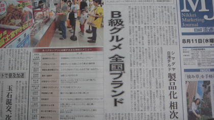本日の日経MJに当研究所所長の矢野新一のコメントが載っています。写真の一面の左側に玉石混淆、次は淘汰という見出しがありますが、こちらに矢野新一のコメントが載っています。ご当地B級グルメが広がった背景と今後についてです。今後は見出しのように淘汰が始まるでしょう。ご当地グルメは正念場です。安直に出来たものは、消えていく可能性が高いでしょうね。ご当地グルメのみなさん頑張って下さい。
