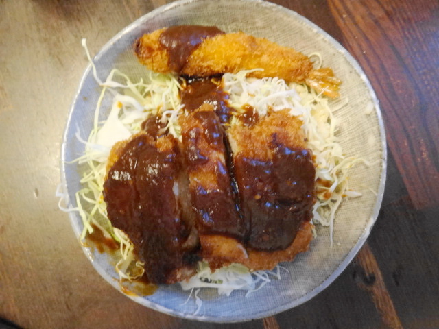 カツ丼は、一般的な卵とじ(煮カツ丼)のほかに、ウスターソースで味付けする「ソースカツ丼」(山梨や長野など)や「ドミグラスソースカツ丼」(岡山など)、「醤油だれカツ丼」(新潟など)、「味噌カツ丼」(名古屋など)があります。写真はソースカツ丼の味噌だれ版です。上にあるのは小さいエビです。ご飯の上にキャベツの千切りを乗せ、トンカツを置いて、味噌ダレをかけました。タレは、みそ+出汁+ミリンで作ったものですが、ウスターソース+ケチャップなどお好みで。たまには、いつもと違うカツ丼もいいですよ。