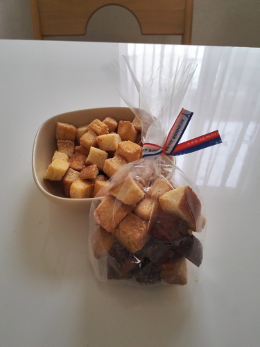 近所の女の子にバレンタインのチョコをもらったおとうと君。お返しに食パンラスクを作りました。おとうと君は食パンのカットを担当。チョコを溶かすのとバターを溶かすのは姉が担当。後はオーブンでカリカリに焼いてまぶすだけだから簡単学校で友達に教えてもらってパチンコを作ったおとうと君。真剣にかまえて〜