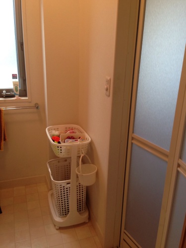 ヘアゴムや小物が多くなってかごに入りきらないので脱衣所に棚をつくりましたビフォアーアフターペンキ塗りはおとうと君と父が担当
