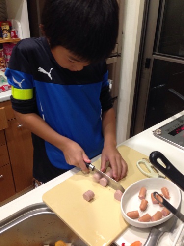今日はおとうと君、遠足です。宿題のお弁当作りは米洗いとウインナーカット行ってらっしゃい(^o^)
