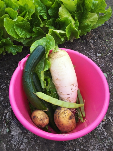 畑で夏野菜がとれ始めました。ジャガイモと大根も少し収穫出来たで、先週の晩御飯は畑三昧どれも美味しかった